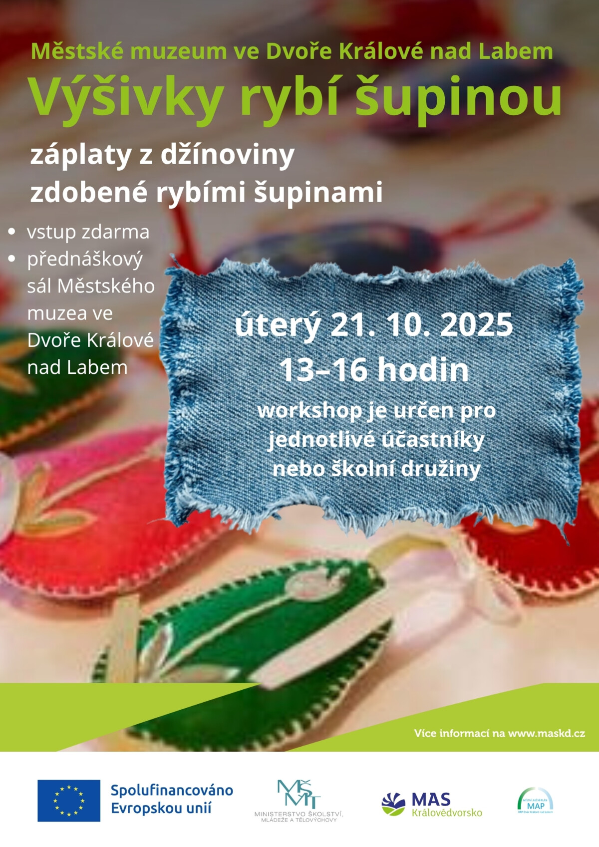 21. 10. si můžete od 13 hodin do Městského muzea ve Dvoře Králové nad Labem přijít vyzkoušet tradici vyšívání rybí šupinou.